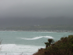 | 明け方、暴風域を抜けました。 長い夜でした。 急な坂道を下る自転車がブレーキをかけている時のような音が耳について、全く眠れませんでした。 今も吹き返しの西風は強く、波の高い状態は続いています。 先ほど、警察の方と、役場の方が被害調査に見えました。 風の強いことでは有名なところなので、ご心配いただき有難いことです。 畑の様子は確認中です。状況がわかりましたらご報告します。 |