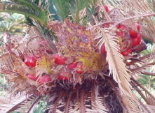 | ソテツの実。 赤いところは毒があるので取り除くと、中はデンプンなので、味噌の材料になります。 抗がん作用もあるらしく、ソテツ入りのお味噌は珍重されているそうです。 ソテツそのものの需要も多いので、実から苗にしたてて販売されるとのこと。 いずれにしても、この実を集めることで、ちょっとしたおこずかい稼ぎになるようです。 |
