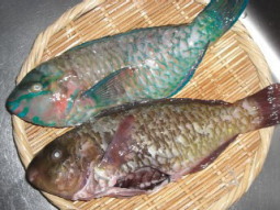 | ブダイ(あってるかな?)というお魚。 漁に出られた人からのお裾分けです。 皮に熱湯をかけたり、バーナーで炙ったりしてお刺身もOKですが、今回は煮魚にして食べました。 身が軟らかいので、塩を振って、少しねかせたら良かったかな。 |