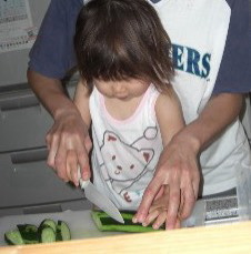 | 今日は幼稚園でリトミック。 外遊びもして楽しんできました。 帰りに天城町の図書館とコンビニへ。 目的の牛乳と食パンは全く無し。 午前中の品揃えの悪さは島の宿命でしょうね。 包丁初挑戦。 普段出来ないことをさせてもらうと、なんだか楽しいって感じです。 この頃は敬遠気味だったキュウリを食べる気になったよう。 でも、皮は出してました。 今度は全部むいてみよう。 |