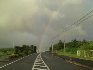 | 土、日と天城町のお祭りで、今日の夕方はパレードがありました。 いつもお世話になっている幼稚園の鼓笛隊も参加するので、見物に行ってきました。 園長先生の熱心な指導で、皆上手くなるんでしょうねぇ。ホント感心してしまいます。 坂を下ってくる踊り連も迫力がありました。 オナカもすいたし、雨も降ったので早々に帰りましたが、ナカナカ楽しかったです。 帰り道には虹がかかっていました。 |