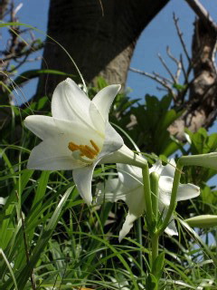 | 雑草に守られながら咲きました。 黒木さんから頂いたユリは、今年で3年目の花です。 そもそもは、デイゴの根元の盛り上がった土をカバーするために石積みしたスペースで、花壇と称していましたが、すっかり草ボウボウ。 小まめに草取りしていた時は、挿し木したハイビスカスが風でやられて、なかなか大きくなりませんでした。 雑草があった方がとりあえず風除けになるので、まぁいいか・・・って感じです。 |