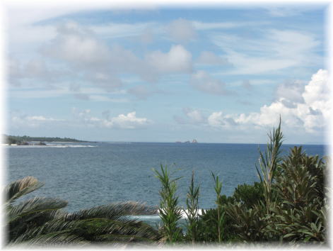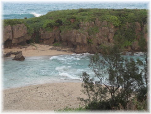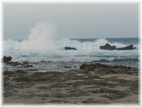 | まだ波が高いですが、いく分落ち着いてきました。 大潮なので、満潮時には道のところまで水が来ます。 砂浜の様子が変わり、両方から押し寄せた波が戦っていて、海峡のようです。 こうなっていると、怖くて海遊びも無理です。 |