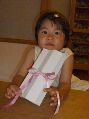 | 芽衣は、今朝6時前から起きていました。 「これが出来たらかあさんを起こしに行こう」という話声が聞こえてきます。 今日は私の誕生日。 呼ばれて行ってみると、こんな大きなプレゼントが用意されていました。 特大の袋に「かあさん お(た)んじょうび おめでとう」「かあさん だいすき」と書かれていて、中には折り紙がいっぱい詰まっていました。 誕生日にはプレゼント、なんて思いついてくれるようになったんですねぇ。 そのうち、肩たたき券とかくれるようになるのかな。楽しみ。 45にもなって誕生日もないでしょうって感じかもしれませんが、年をとるのも悪くないものです。 |
