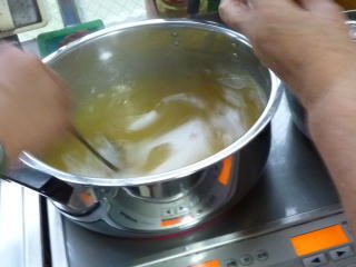 昨日は午後からパインジャム作りをしました。 皮をむいて一口大に切ったパインをミキサーにかけます。 鍋に入れて火にかけ、ひたすら灰汁取り。 20分くらいかけて灰汁を取ると、透明な液が見えてきます。 灰汁を取り終わると、量は半分くらいになってしまいます。 |
