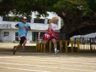 学年対抗の保護者リレー。 仮装(女装!)がすごいです。 でも走りは真剣。 |