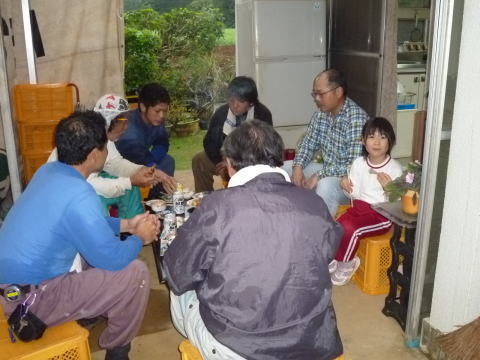 3月8日 工事再開。一気に棟が上がりました。 この画像を見て、玄関はどうなるのか?という疑問が湧く方もあるかも。 元々実家では玄関は形だけ、訪ねてくるお客様も、98%はテラス側から声をかけられます。 そんなことで、玄関は使えなくて良いという結論に。 選果場と母屋の通用口として使用することになりました。 午後からは雨の中の作業になってしまいました。 作業後、手料理で心ばかりのお祝いをしました。 |