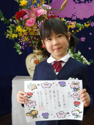 3月16日 終業式 今年度のお休みがインフルエンザ(出席停止)だけだったので、皆勤賞をいただきました。 とっても誇らしげな表情でした。 |
