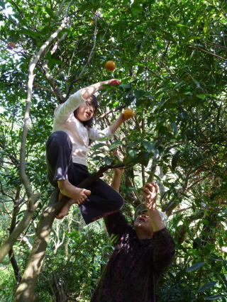 | 山(さん)へ行ったら、畑に行こうという話になり、通路に少しだけ残っているミカン採りをしました。 脚立もないし、足場も悪いし、でも樹に上り、おばあちゃんに枝を引っ張ってもらってなんとか届きました。 |