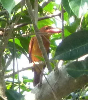 | 連休が終わりました。 梅雨入り宣言が早すぎたみたいで、今日もカラッとしています。 今年のアカショウビン、畑にはもっと早くから来ていたようですが、我が家へは3日の日に飛んできました。 そして、今日、家の前のガジュマルに止まっているところを目撃! 初めて写真に撮れました♪ アップで見ると、顔はあんまり可愛くないですが、飛んでる姿、色、何より声が美しいんですよね〜。 |