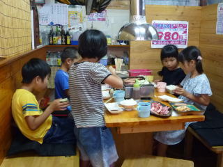 手作りカレーを食べたり、 おこずかいでかき氷を買ったり。 最後は恒例ワイド節に六調。 楽しい夜でした。 |