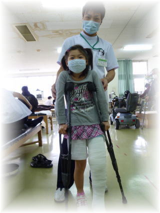 | ご心配をおかけしてすみません。 芽衣は松葉杖を上手に使いこなし、卒園式の練習では壇上にも上がれるようになっているらしく、最後の園生活を楽しんでいます。 家でもお転婆ぶりは健在で、右足の指でロープをつかみ、両手の力を駆使して、高いブランコにも乗っています。 足の骨折って、ベットに横たわり、足を吊って、じ〜っとしているようなイメージでしたが、そんなことないんですね。 それに、石膏で固めるのかと思ってましたが、それもかなり時代遅れの発想だったみたい。 包帯のようにテープ状になったものを水で濡らして、それをぐるぐる巻いてました。 状態に合わせて綺麗に巻いて、カチンコチンの足が出来あがり! その上から包帯を巻いてくれましたが、これは汚れ防止程度のことみたいです。 |