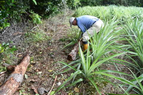 パイナップル園では、防風樹が、電気柵やパイナップルの上に倒れかかっているところがありました。 折れた枝が飛んで来て、葉が傷ついているようですが、そう問題はないそうです。 よかった。 |