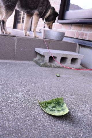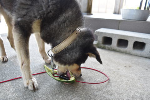 | マリーはスイカが大好き。 皮がペラペラになるまで綺麗に食べる。 こうも暑くっちゃ、人間も犬もスイカが一番ってことかな。 |