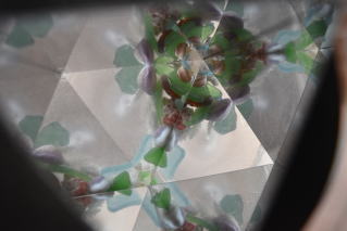 ノリの空き容器を利用した万華鏡。 シーグラス+貝殻+サンゴ 色合いは少々渋めですが、いい感じ。 飽きずに眺めてしまいます。 万華鏡中毒状態♪ |