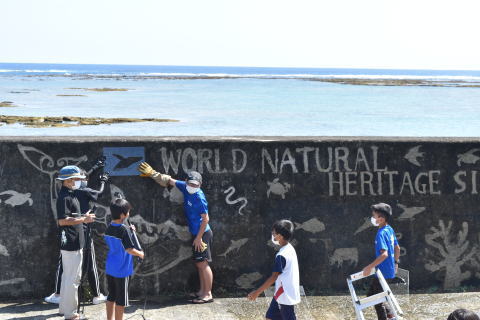| 昨日、ジュニアリーダークラブの活動に参加。 リバース・グラフティという手法で、壁画制作。 要は、高圧洗浄機で絵を描いていく。 下書きを元に、フリーハンドで描いたり、型抜きしたアクリル板を使ったり。 高圧洗浄機で飛び散る、汚れた水しぶきを浴びながら、暑い中の作業でした。 なかなか素敵な仕上がりになりました。 奄美新聞の記事はこちら。 |