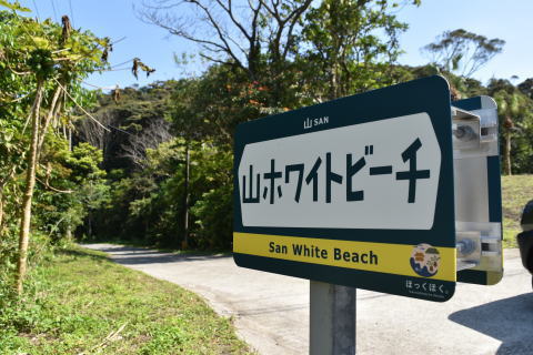| 新しい看板が設置されている。 ちょっと小さ目で、デザインがカワイイ♪ 地名バージョンと、観光地(ビーチの名前)バージョンがあるもよう。 校区のカラーに合わせて、山は黄色、花徳はピンクが使われている。 北部しかまだ見ていないけど、他のところも探してみよう♪ |