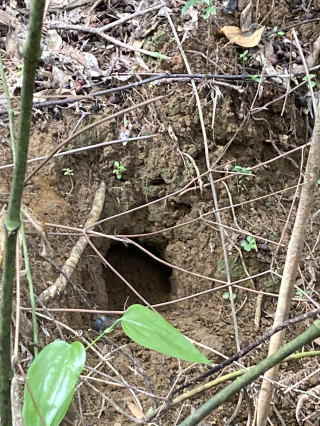| アボカド園に落ちていたクロウサギの毛↓ | クロウサギにかじられたタンカンの幼木↓ | クロウサギの巣穴↓ |
