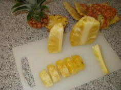 底を下にして置き、包丁を上から下に下ろして削ぐように切ります